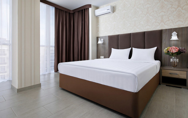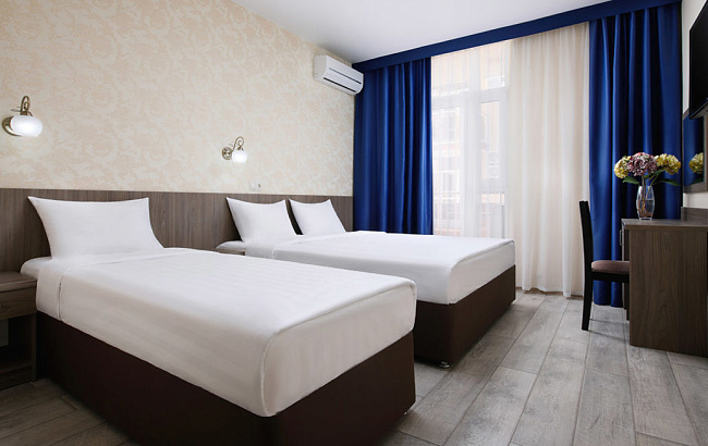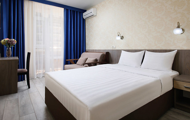 Восьмиэтажный корпус пансионата оснащен лифтом. Обширный жилой фонд включает 148 номеров разной категории комфортности и способен единовременно разместить более 370 отдыхающих. Гостей ожидают 2-3-местные номера Стандарт, а также двухкомнатные Семейные номера. Все номера оснащены спутниковым телевидением, мини-холодильником и кондиционером.